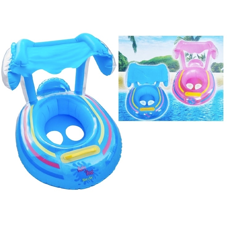 Dětský člun se stříškou a otvory na nožičky. Možnost výběru ze dvou barev - modrý nebo růžový.Nafoukaný cca - 70 x 56 x 58cm. przeczytaj całość
