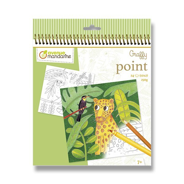 Omalovánky Avenue Mandarine Graffy Point s motivy zvířátek z džungle určené k vybarvení pomocí spojování čísel. Stačí spojovat čísla jedno po druhém až se objeví kresba a potom začít vybarvovat. Omalovánky pro 2 věkové skupiny ve 2 úrovních obtížnosti. Omalovánky obsahují 24 listů, 12 motivů po 2...