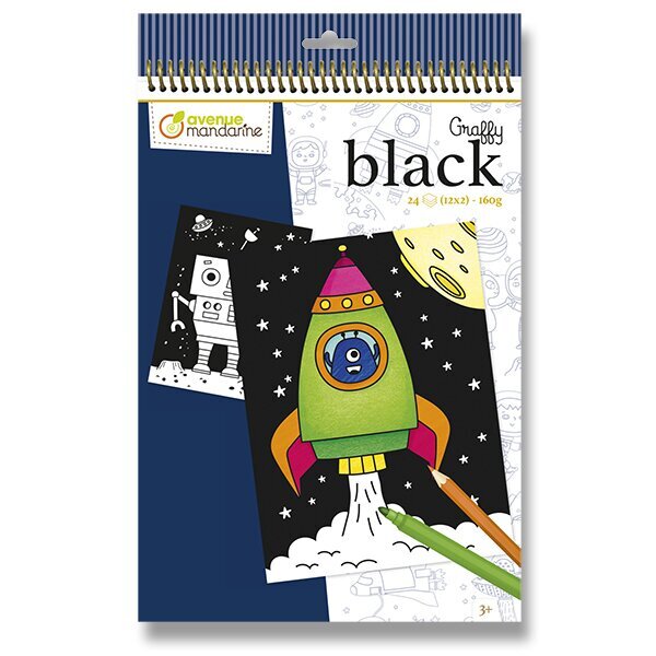 Omalovánky Avenue Mandarine Graffy Black ve velkém formátu s motivem vesmíru. Černá podkladová barva papíru skryje možné přetahování. Předřezané listy pro případné snadnější vytržení z bloku. Omalovánky obsahují 24 listů, 12 motivů po 2 ks. Gramáž 160 g.Vhodné pro děti od 3 let,,Rozměry balení:... przeczytaj całość