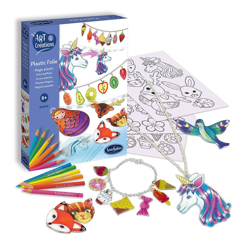 Baw się, tworząc oryginalną biżuterię z kurczliwego plastiku z zestawem Magiczna folia - Jednorożce, pochodzącym od francuskiej marki Sentosphere. Pokoloruj wydrukowane i wstępnie wycięte wzory na plastikowych foliach, a następnie włóż je do piekarnika rozgrzanego do 180°C. Po kilku minutach ilustracje zmniejszą się 7 razy i stwardnieją, tworząc piękny i trwały element. Umieść go na dołączonym uchwycie na biżuterię i noś swoje prace np. jako bransoletki lub naszyjniki. Zawartość zestawu: