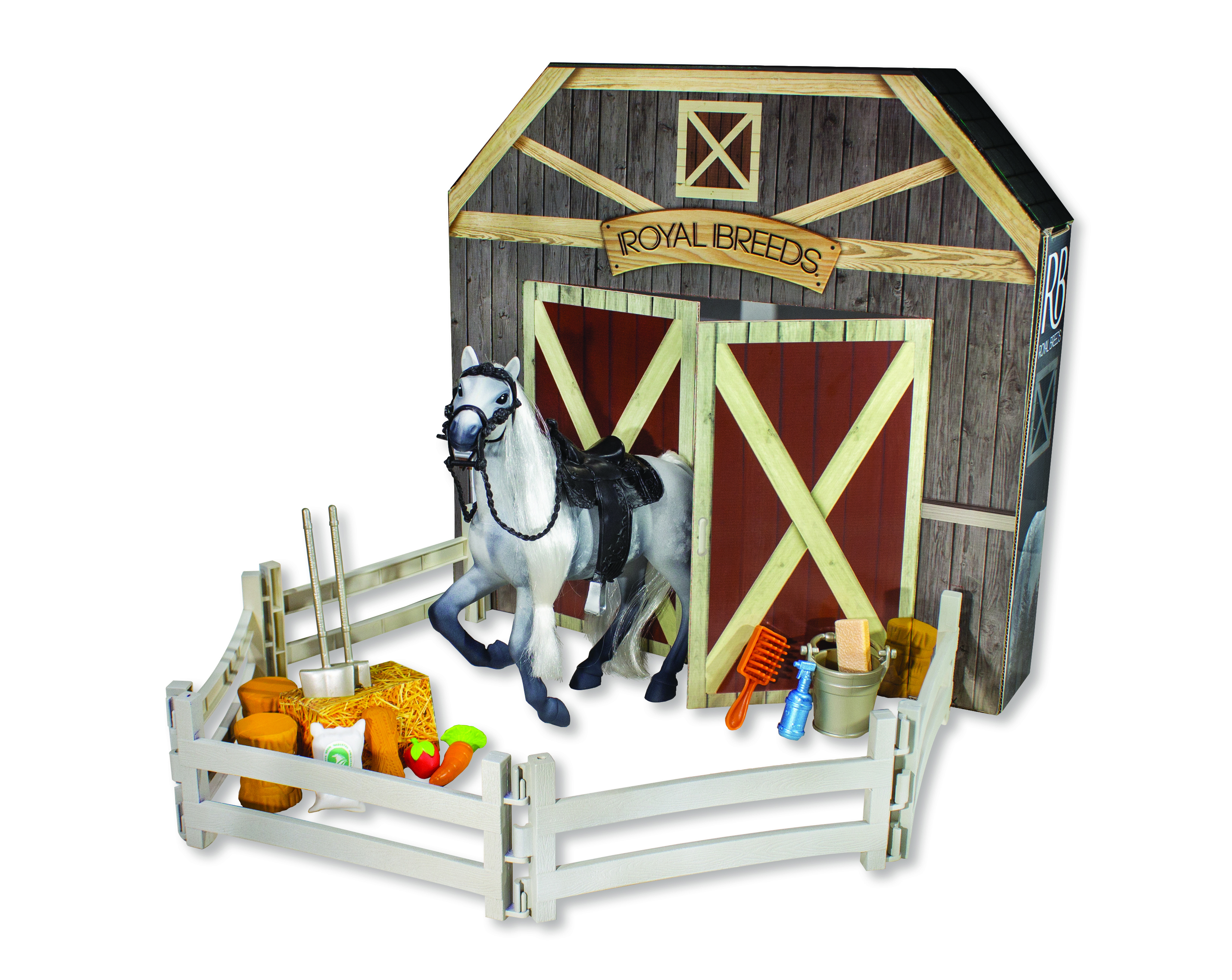 Royal Breeds Koník s ohradou. Velikost 17 cm. Obsahuje také různé příslušenství. Zadní strana obalu se otevírá jako vrata do stájí. 2 varianty - hnědý, šedý. przeczytaj całość
