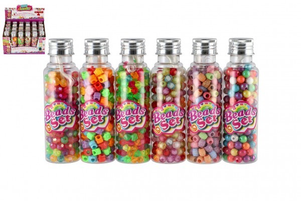 Korálky se šňůrkou plast mix barev v plastové dózičce 3,5x12,5cm 24ks v boxu