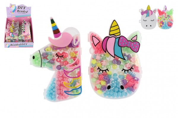 Korálky plastové barevné 2 druhy v plastové krabičce tvaru hlavy jednorožce 10x15cm 12ks v boxu