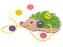 Uroczy jeżyk zgubił guziki. Pomóż je odnaleźć i mocno przymocować do szpilek, aby już się nie zgubiły. Zabawa polega na przewlekaniu sznurka przez otwory tak, aby wszystkie guziki zostały przytwierdzone do szpilek jeżyka.
