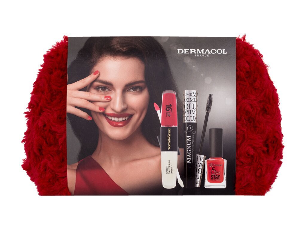Dermacol Magnum řasenka Magnum Maximum Volume 9 ml Black + dlouhotrvající rtěnka 16H Lip Colour 8 ml 20 + lak na nehty 5 Day Stay 11 ml 21 + kosmetická taštička