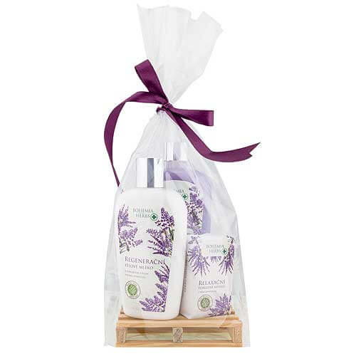 Dárkový balíček levandulové kosmetiky - tekuté mýdlo, tělové mléko a toaletní mýdloKrémové tekuté mýdlo s olivovým olejem, extraktem z bylin, jogurtovou aktivní složkou a vůní levandule 300 ml. Je vhodné k mytí celého těla. Jde o unikátní kombinaci jemných mycích látek s blahodárnými účinky...
