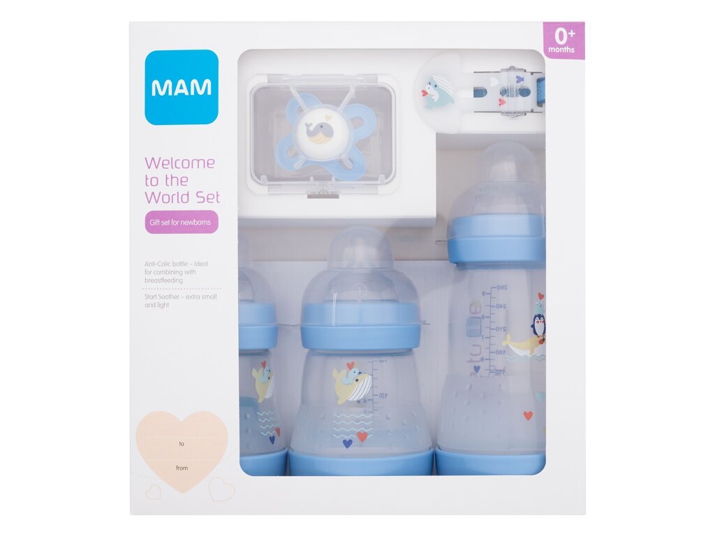 MAM Welcome To The World Set kojenecká láhev Anti-Colic 160 ml 2 ks + kojenecká láhev Anti-Colic 260 ml 1 ks + dudlík Start 1 ks + stužka na dudlík 1 ks
