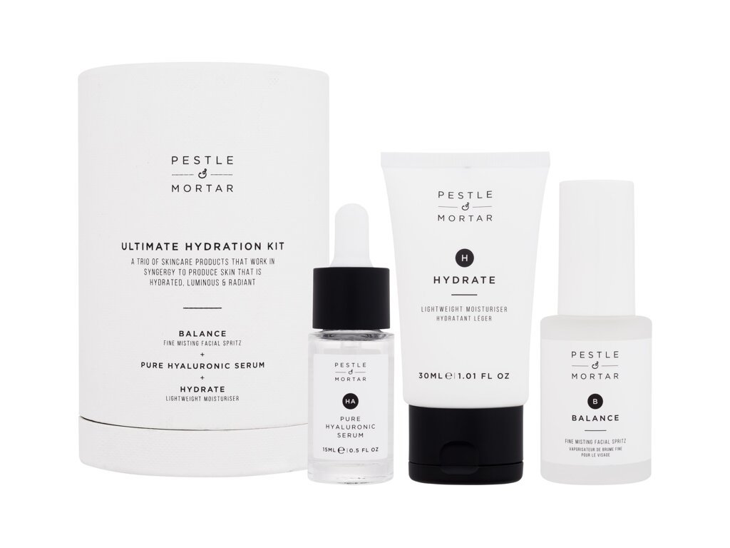 Pestle & Mortar The Ultimate Hydration hydratační pleťová voda Balance Fine Misting Facial Spritz 30 ml + hyaluronové pleťové sérum Pure Hyaluronic Serum 15 ml + hydratační pleťový krém Hydrate Lightweight Moisturiser 30 ml