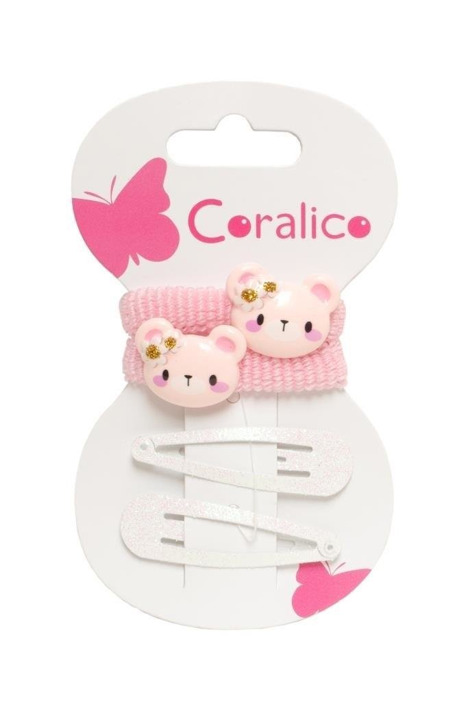 Zestaw frotek z motywem misia w kolorze różowym i białe spinki. przeczytaj całość