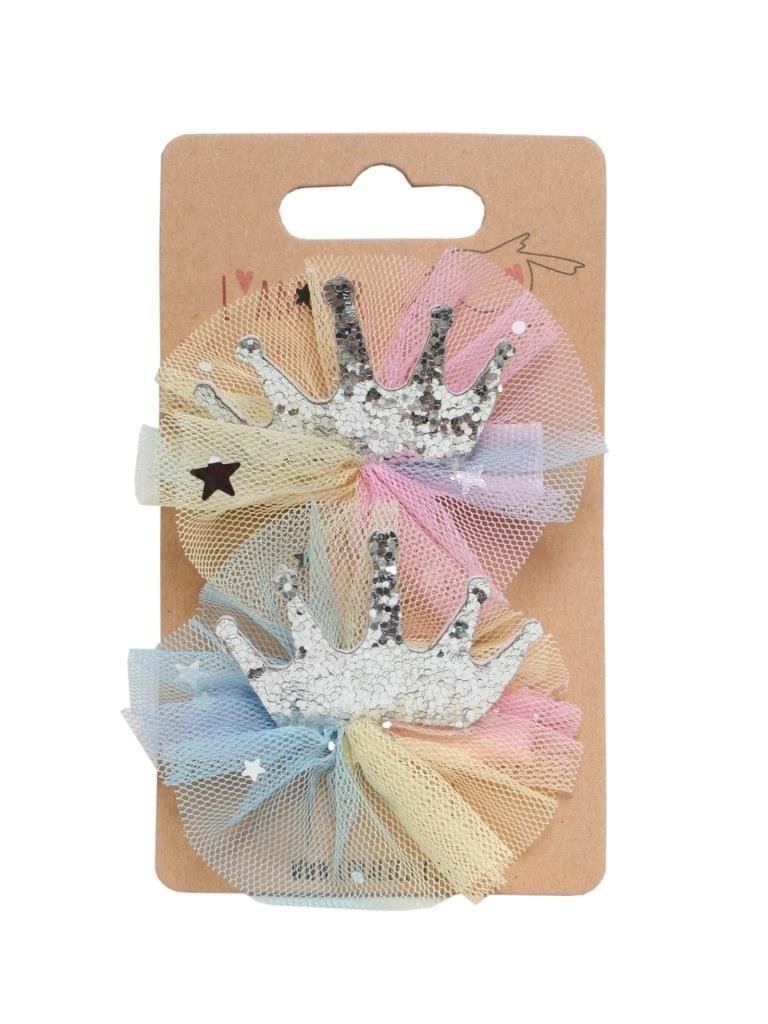 Zestaw klipsów ze srebrną koroną z tiulem. przeczytaj całość