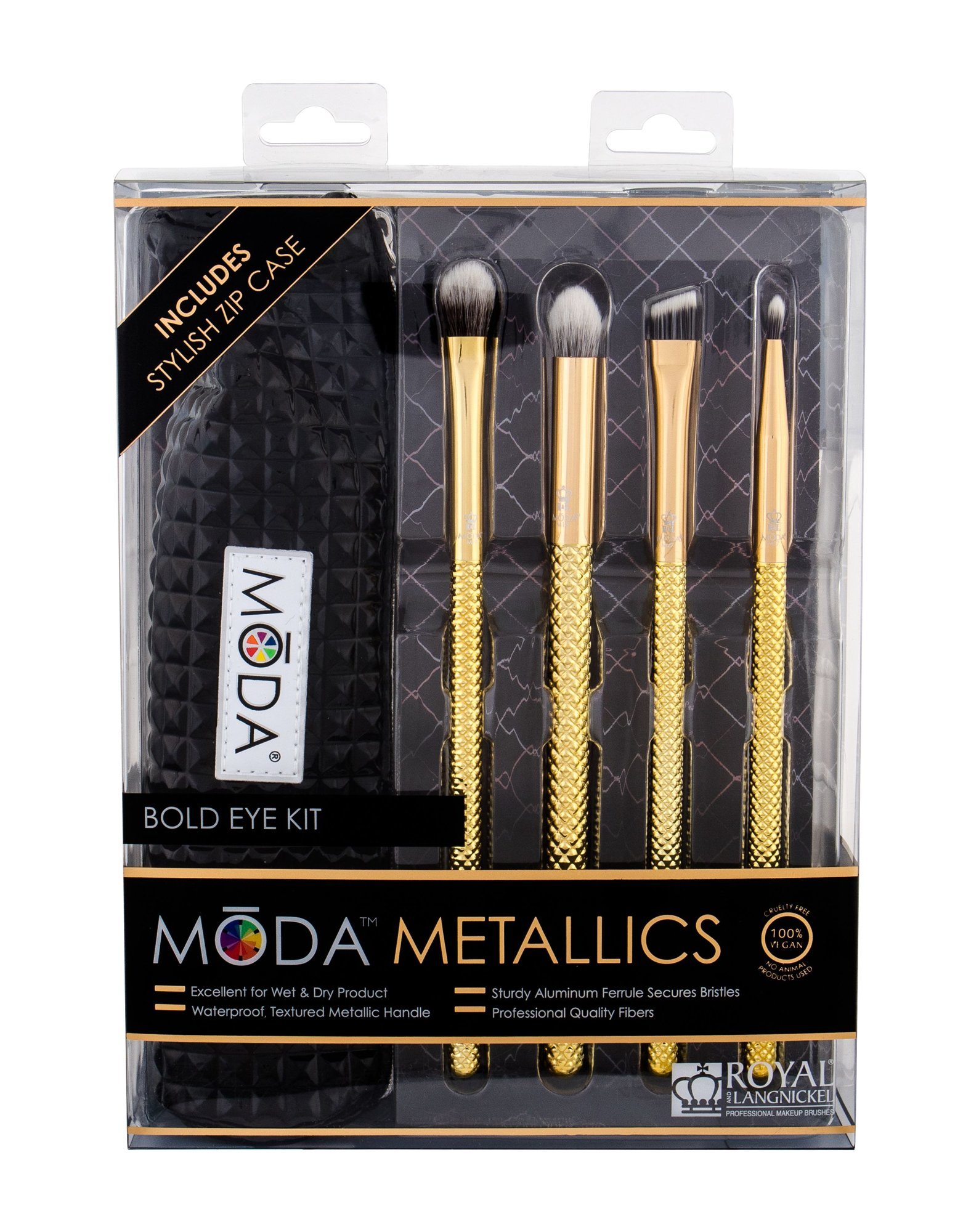 Royal & Langnickel Moda Metallics štětec na oční stíny 1 ks + štětec na oční kontury 1 ks + štětec na linku 1 ks + štětec na obočí 1 ks + cestovní pouzdro