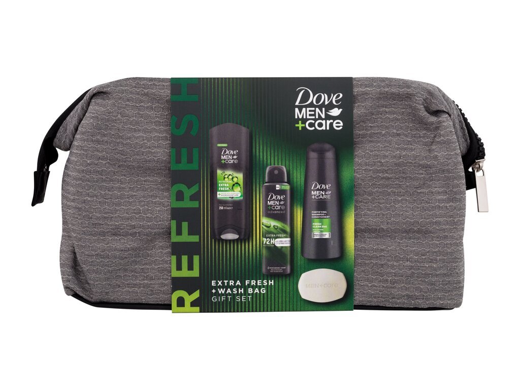 Dove Men + Care sprchový gel Men Care Extra Fresh 250 ml + antipesrpirant Men Care Advanced Extra Fresh 150 ml + tuhé mýdlo Men Care Extra Fresh 90 g + šampon a kondicionér Men Care Fresh Clean 2in1 250 ml + kosmetická taštička