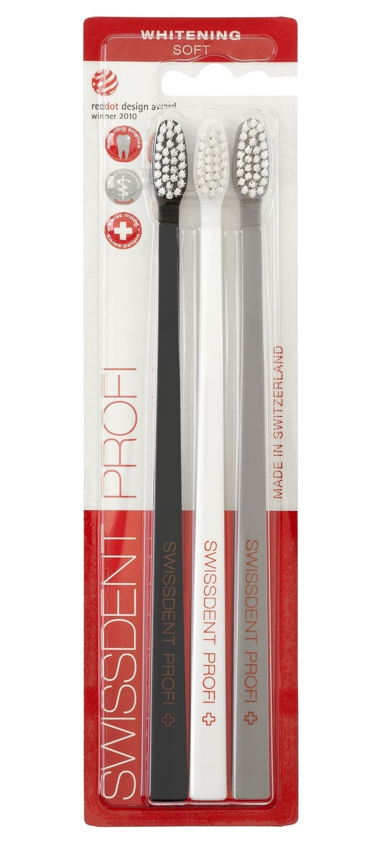 Trojice barevných zubních kartáčků Swissdent Profi Whitening Soft Trio s měkkými vlákny. Díky obsahu mikročástic zvyšují účinek bělicích zubních past Swissdent. Vyznačují se malou hlavicí, která vyčistí i špatně přístupná místa a rovnou rukojetí, navrženou podle ergonomie zubařských nástrojů,...
