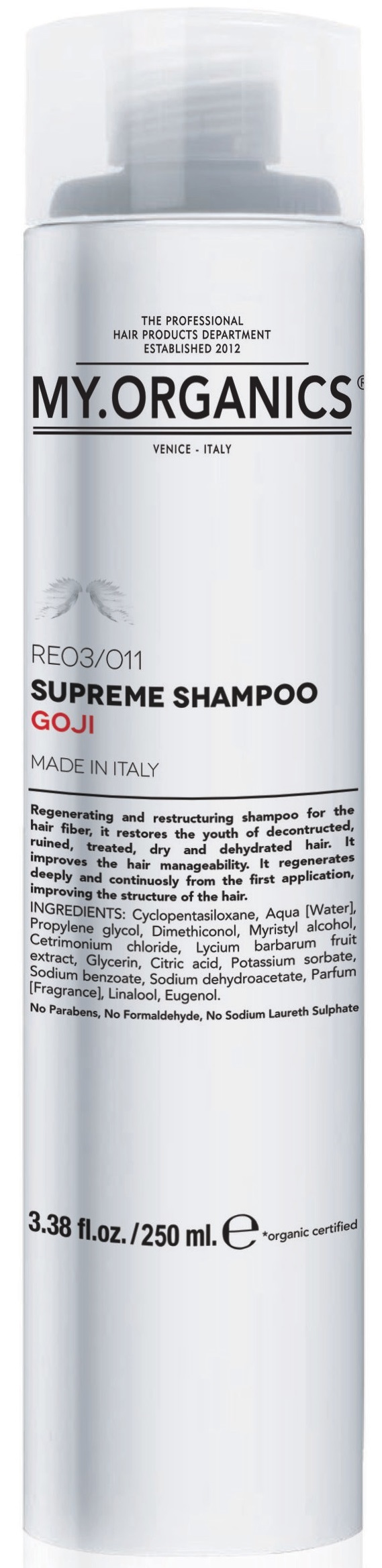 Linia produktowa Goji MY.ORGANICS Resurrection oferuje wyjątkowe rozwiązanie dla włosów ekstremalnie obciążonych, zniszczonych, wyczerpanych, porowatych i bardzo suchych - niezależnie od przyczyny: predyspozycji genetycznych, źle wykonanego farbowania, rozjaśniania czy innych zabiegów chemicznych, a także działania czynników zewnętrznych takich jak smog, chlor, sól lub powtarzane nieprawidłowe mycie z użyciem nieodpowiednich lub nieprofesjonalnych produktów. Resurrection = zmartwychwstanie to specjalna, kompleksowa seria do rekonstrukcji włosa. Potrafi zapewnić włosom głęboką, intensywną i długotrwałą regenerację; dzięki wartościowym aktywnym składnikom przywraca włosom ich pierwotne piękno, wzmacnia ich wewnętrzną strukturę oraz dodaje siły, objętości i jedwabistej gładkości. Dzięki intensywnemu działaniu przeciw przejawom starzenia dogłębnie odbudowuje włosy, nadając im lśniący i promienny wygląd. Dodaje objętości i odżywienia. Skutecznie zwalcza wolne rodniki, które są przyczyną starzenia struktur kapilarnych, dzięki czemu zapobiega degeneracji włosów. Regenerujący szampon MY.ORGANICS Supreme Shampoo Goji przeznaczony jest do rekonstrukcji włókien włosowych. Przywraca młodzieńczy wygląd włosom zniszczonym, nadmiernie obciążonym, suchym, osłabionym, porowatym, oklapniętym i odwodnionym. Działanie szamponu polegające na głębokiej i długotrwałej regeneracji jest widoczne już od pierwszych zastosowań. Stosowanie: Zwilżyć włosy wodą, równomiernie nanieść szampon na całą objętość włosów i pozostawić na kilka minut. Spłukać i w razie potrzeby powtórzyć zabieg.