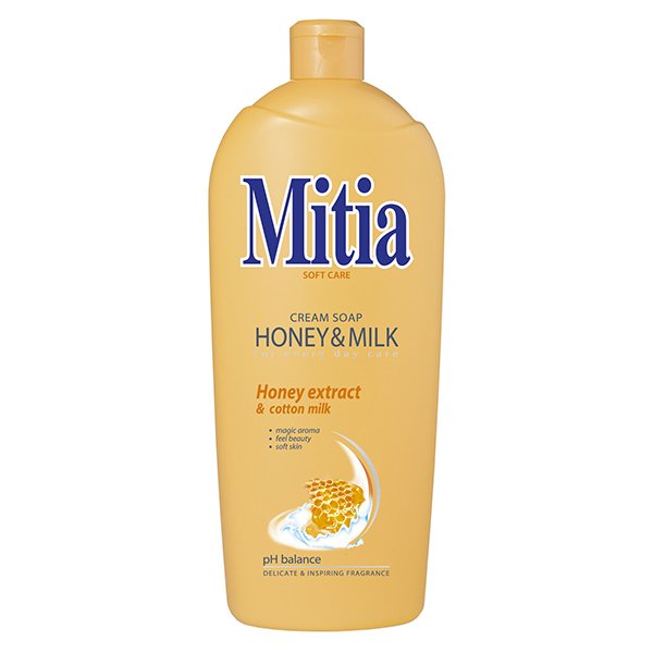 Mitia Soft Care - krémové mýdlo Honey and Milk - 1000ML krémové mýdlo pro jemnou a kompletní péči o Vaši pokožku a ruce. Unikátní složení jemného krémového mýdla zaručuje dokonalý výsledek v podobě hygienicky čistých rukou a přitom jemně hydratovaných a vyživených. Díky použití přírodních esencí a extraktů dodává mýdlo hebkost a příjemnou vůni.Balení 1000ML