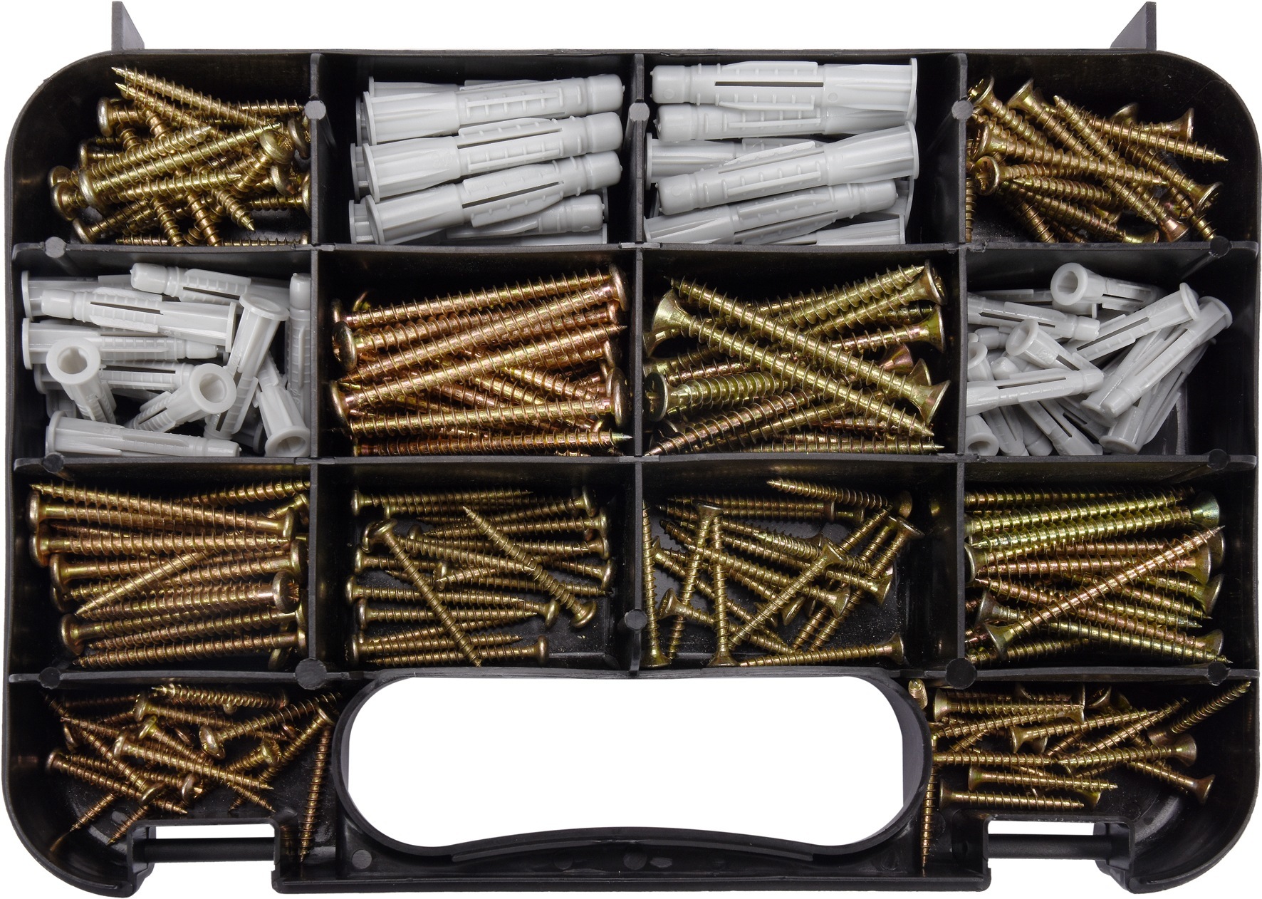 Sada 260 kusů šroubů (plochá / kuželová hlava) a hmoždinek. Sada obsahuje základní rozměry užitečné jak v dílně tak domácnosti. Vše je přehledně uspořádáno v kompaktním plastovém kufříku. Obsah balení 20x PZ s plochou hlavou 3,5 x 30 mm 20x PZ s plochou hlavou 3,5 x 35 mm 20x PZ s plochou hlavou...