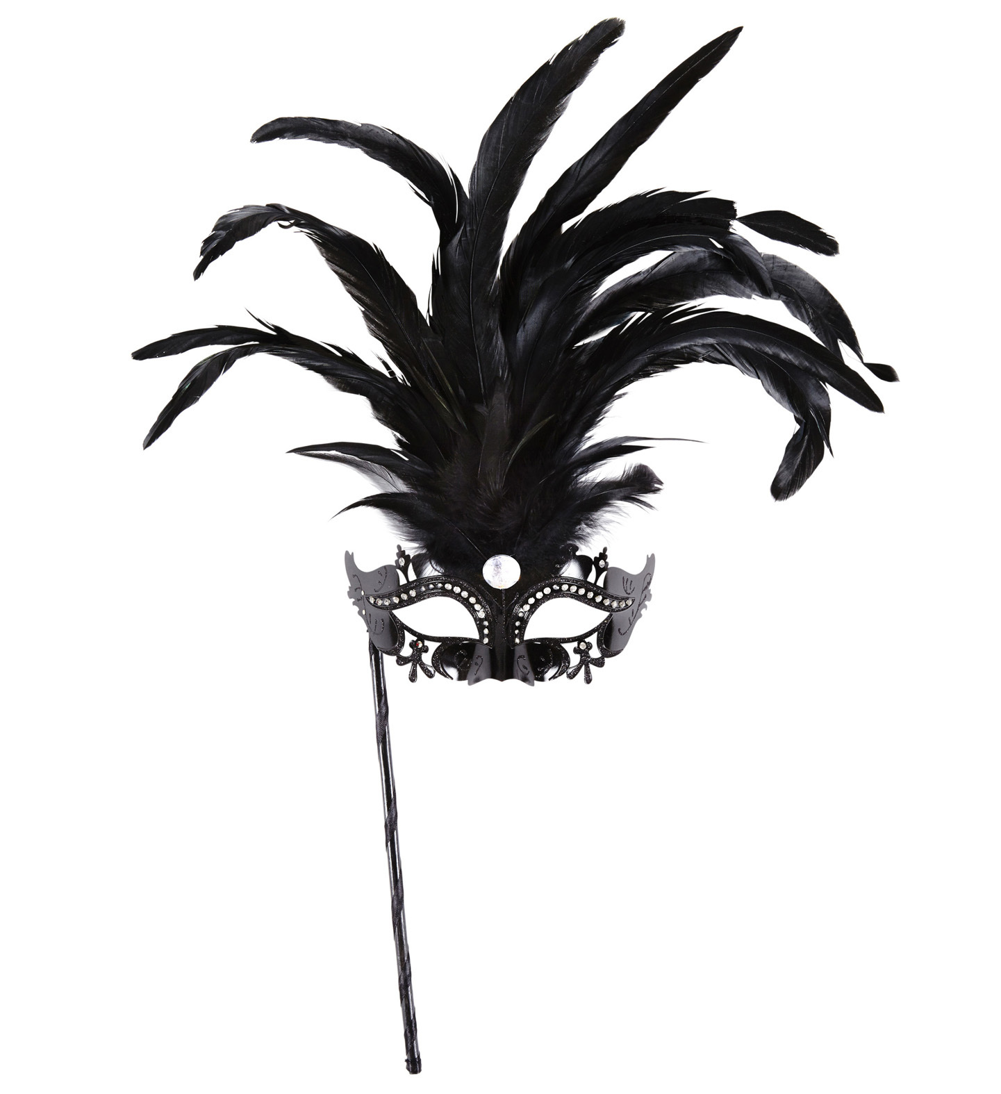 Ozdobná karnevalová škraboška s držátkem. Zdobená kamínky, štrasem, glitrem a peřím. Materiál: 50% PVC , 50% peří przeczytaj całość