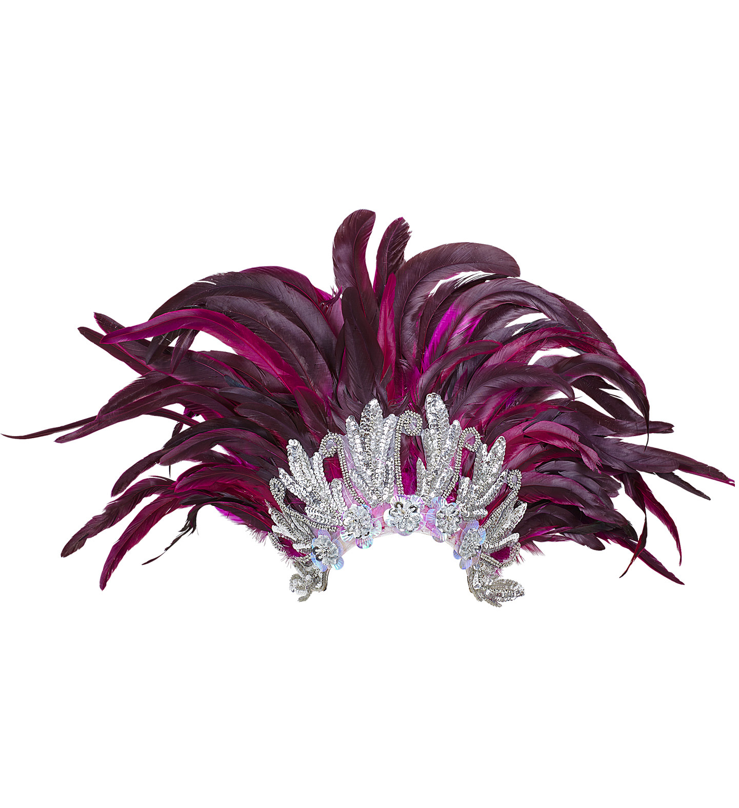 Fialová péřová čelenka se stříbrnou flitrovou dekorací, pro tanečnici ve stylu karnevalu v Riu. Materiál: 91% peří, 9% PE przeczytaj całość