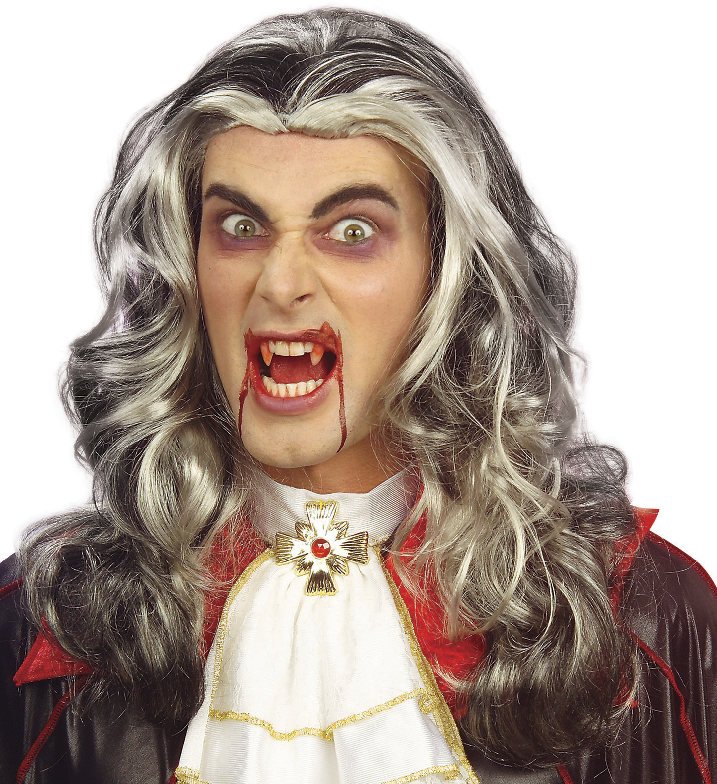 Dlouhá prošedivělá pánská paruka upír, Drákula. Barva: prošedivělá Materiál: 100% polyester Určeno pro: pánská Typ paruky: dlouhá, vlnitá przeczytaj całość