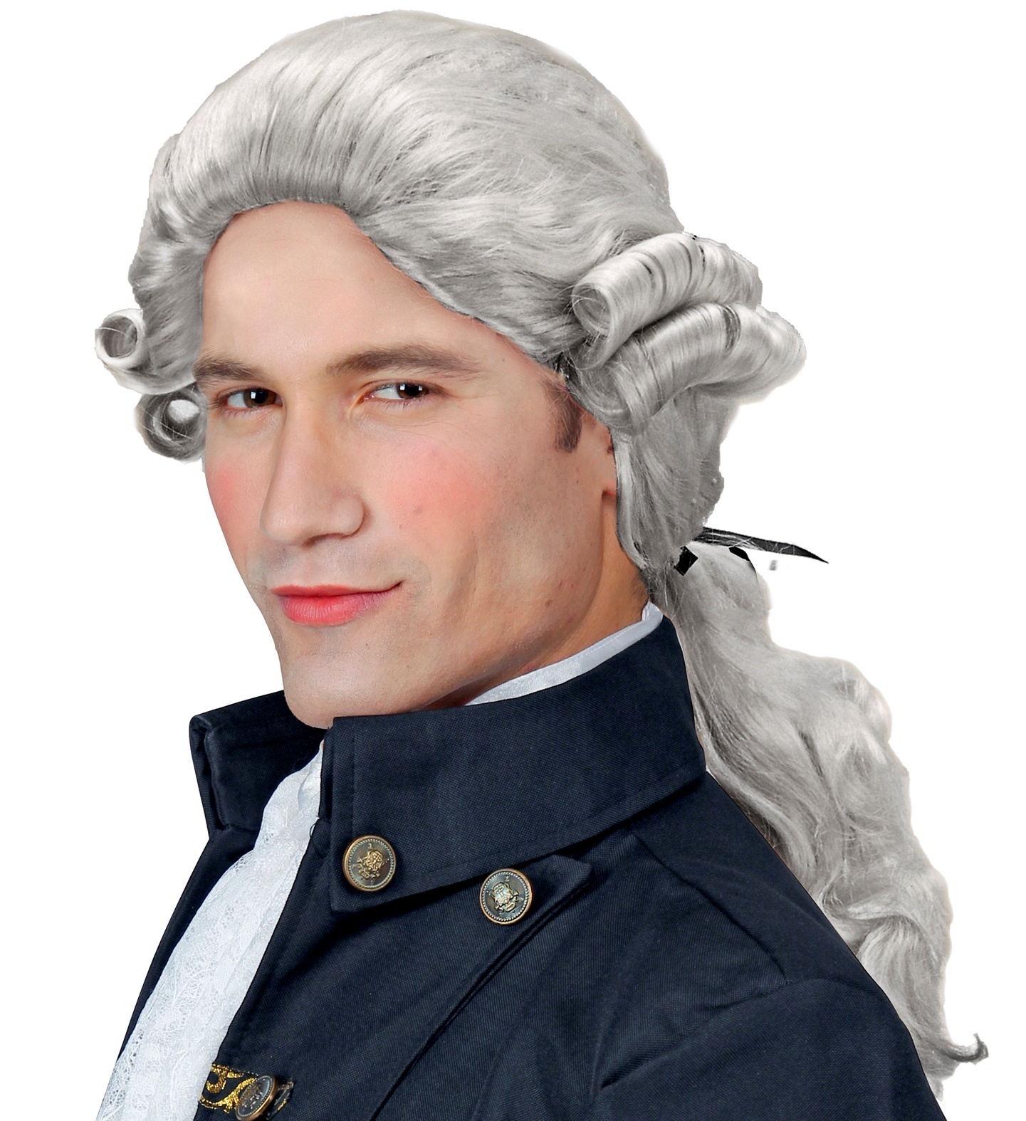 Historyczna peruka markiza de Sade. Z kitą, z czarną kokardą. Pakowana w plastikowe pudełko.