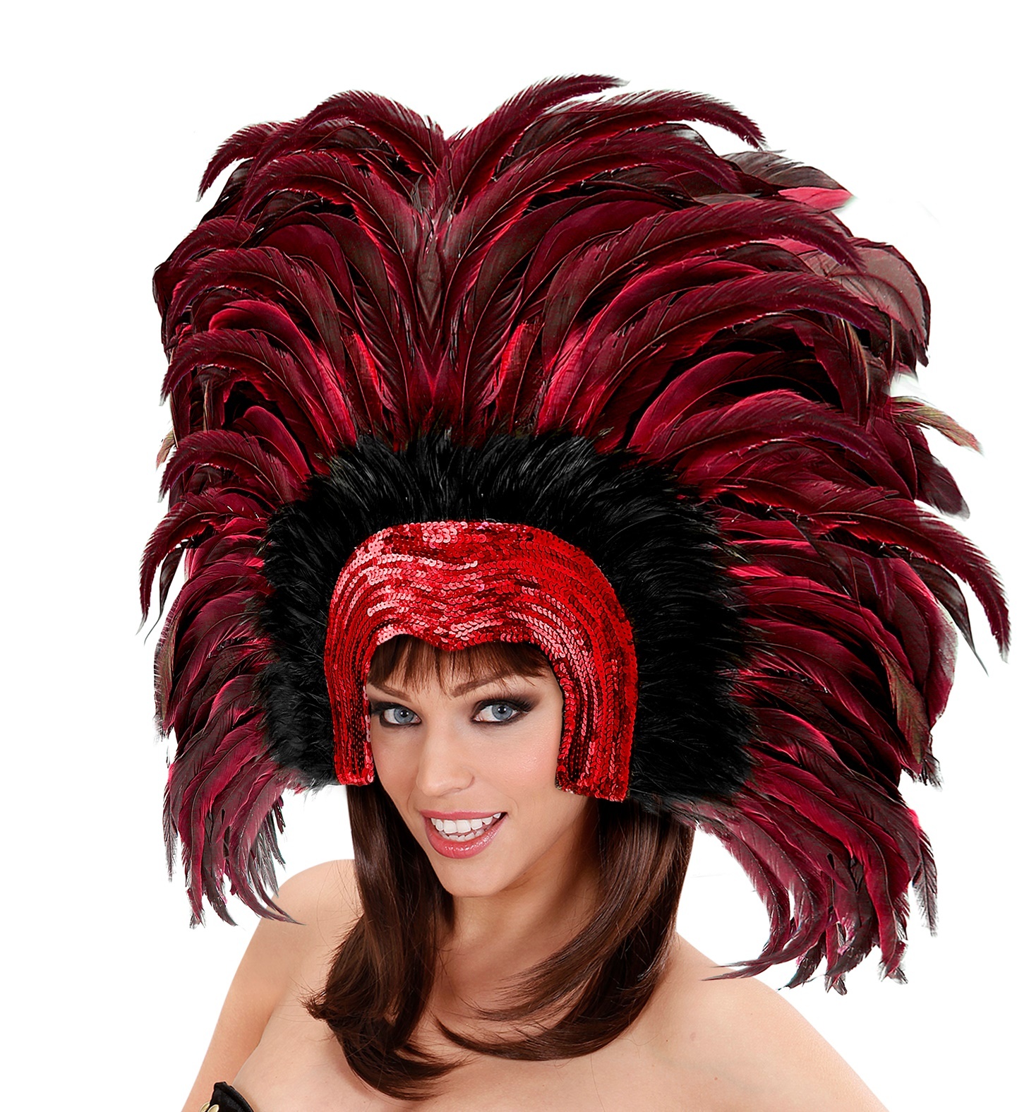 Flitrová čelenka s peřím, Rio. Uchycení gumou, velice stabilní. Barva: červená Materiál: 80% peří, 15% PVC, 5% polyester przeczytaj całość