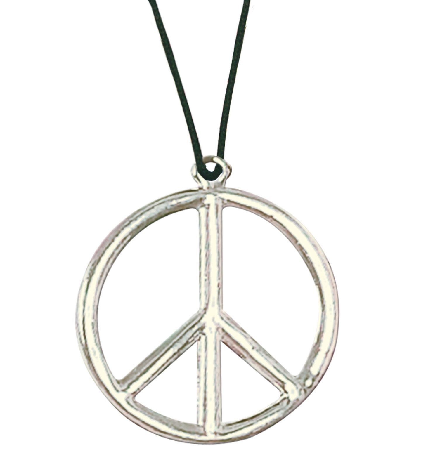 Metalowy medalion "Hippie" w srebrnym kolorze na czarnym sznurku, średnica znaku wynosi ok. 6 cm.