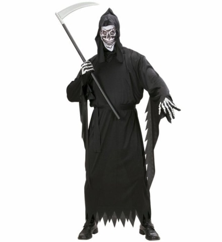 Karnevalový kostým smrťáka. Materiál: 100% polyester Kostým obsahuje: šaty s kapucí, páskem a maskou Velikost: S Kostým určen: pánský przeczytaj całość