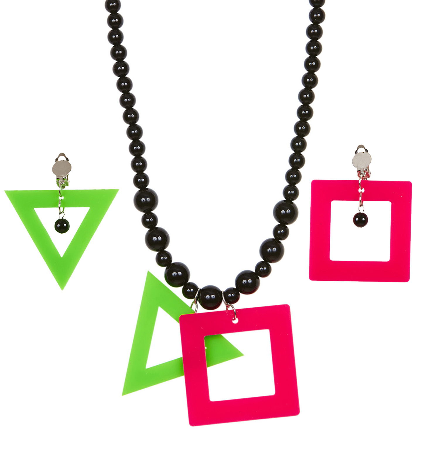 Černý korálkový náhrdelník s neonovými přívěsky a  neonové náušnice, retro disco. Růžové a zelené trojúhelníky a čtverce. Materiál: 100% PMMA przeczytaj całość