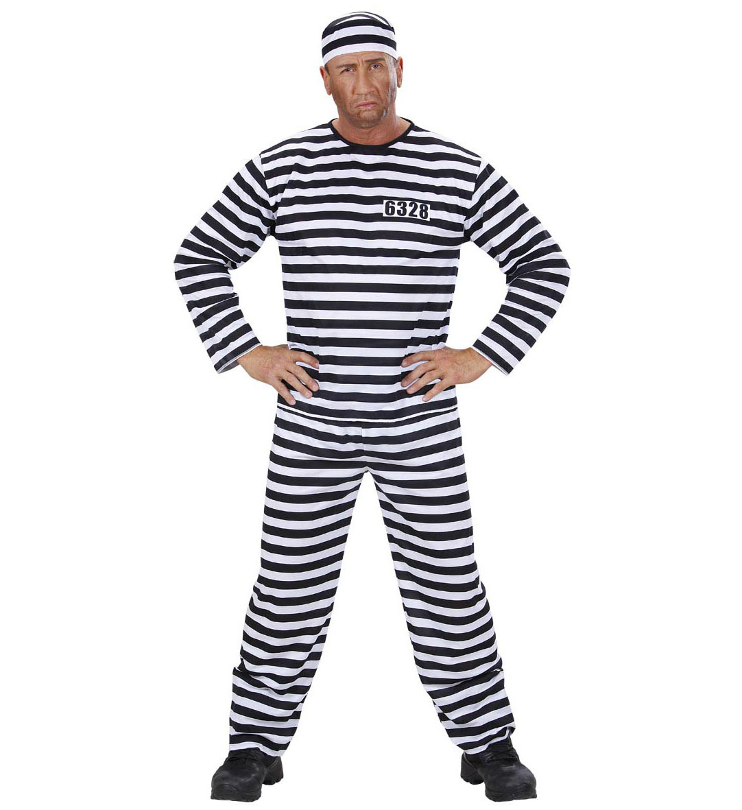 Pánský karnevalový kostým vězně. Materiál: 100% polyester Velikost: S Kostým vězeň obsahuje: kalhoty, triko, čepici przeczytaj całość