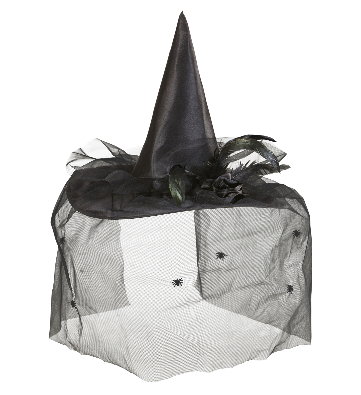 Luxusní černý čarodějnický klobouk s peřím, závojem, květinou a pavoučky. Obvod hlavy: 58 cm Materiál: polyester przeczytaj całość
