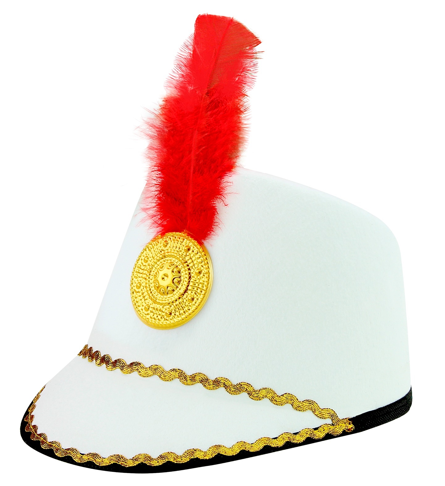 Plstěný klobouček pro děti vhodný ke kostýmu mažoretky. Se znakem, zlatou obšívkou a pérem. Materiál: 100% polyester Obvod hlavy: 55 Barva: bílá przeczytaj całość