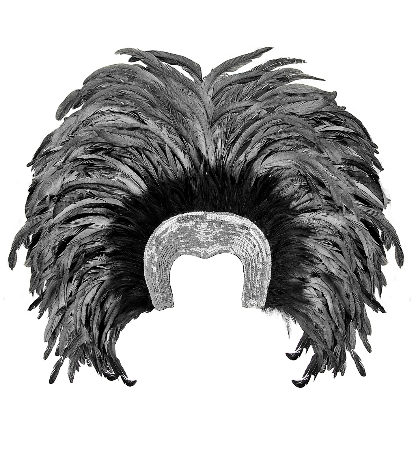 Flitrová čelenka s peřím, Rio. Uchycení gumou, velice stabilní. Barva: stříbrná Materiál: 80% peří, 15% PVC, 5% polyester przeczytaj całość