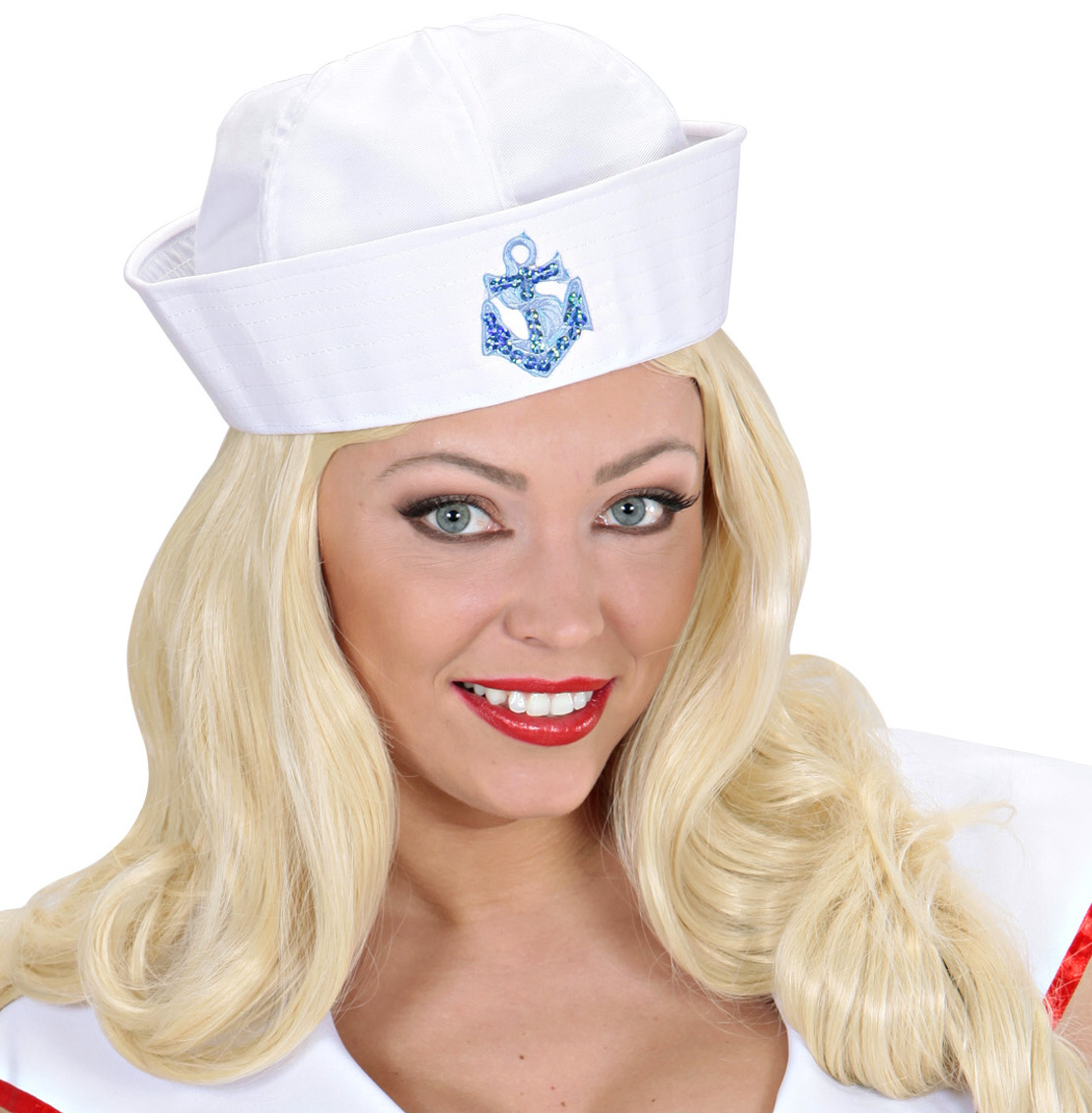 Čepice námořnice s ozdobnou kotvičkou, látková. Bílá látková čepice s vyšitou modrou kotvičkou ozdobenou flitry vhodná ke kostýmu námořnice, od firmy Widmann. Materiál: 100% polyester Obvod hlavy: 56 cm Určeno pro: dámská przeczytaj całość