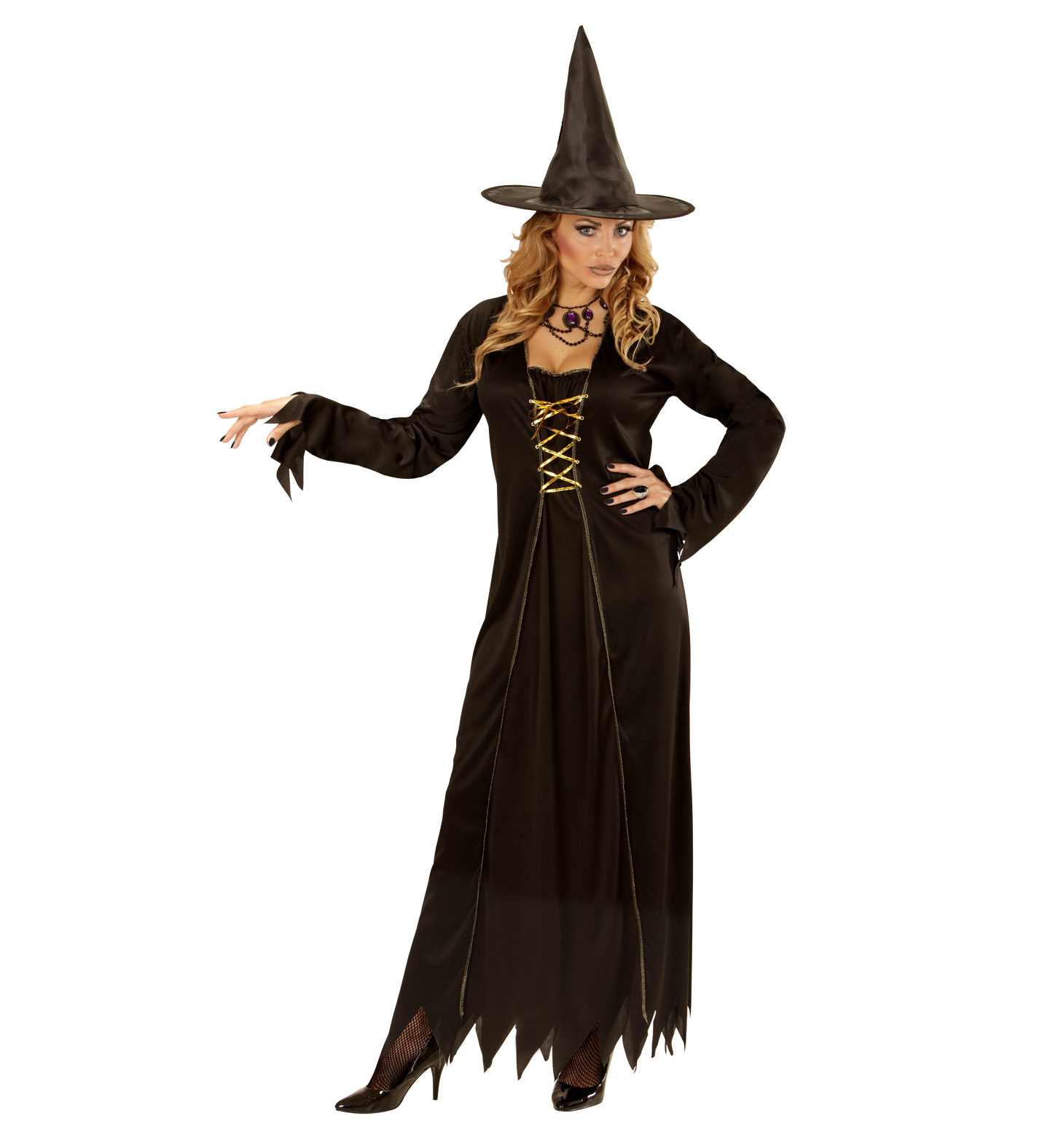 Karnawałowy kostium czarownicy z kapeluszem, ze złotym sznurowaniem. Bardzo elegancki kostium sprawi, że staniesz się piękną czarownicą, która przyciągnie spojrzenia innych uczestników karnawału, firmowego przyjęcia lub palenia czarownic.