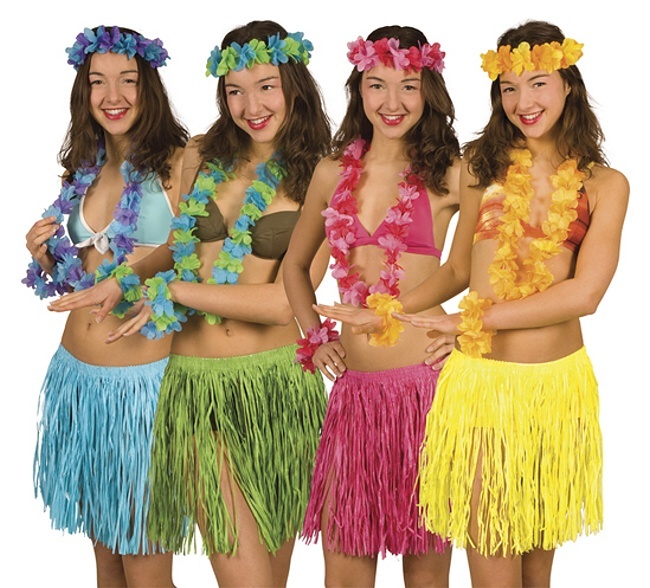 Zestaw hawajski zawiera spódnicę o długości 40 cm z gumką w pasie, rozmiar 64-94 cm, kwiatową opaskę, wianek oraz 2 bransoletki. Popularny zestaw na letnią hawajską imprezę.