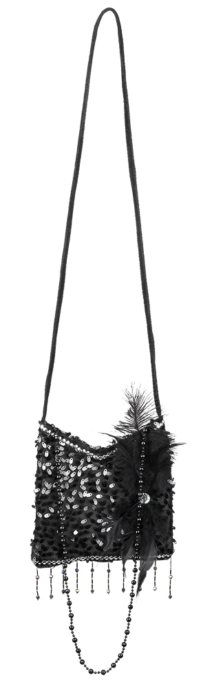Kabelka Flapper, retro, černá, flitrová, s korálky, kamínky a peřím. Zapínaní na suchý zip. Stylová kabelka z 20. let 20. století. Elegantní a s dostatkem místa pro důležité předměty. Perfektní doplněk k charlestonovému outfitu na karneval nebo tematickou párty. Materiál: 35% polyester, 30%...
