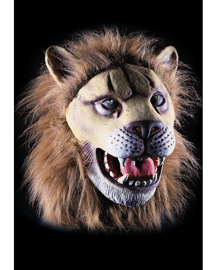 Latexová maska lva s chlupy. Maska se vyznačuje velkou otevřenou tlamou, která zvýrazňuje dlouhé tesáky, je také vybavena hustou hnědou hřívou ze syntetického materiálu, aby byla ještě realističtější. Velikost: dospělá Materiál: latex, polyester przeczytaj całość