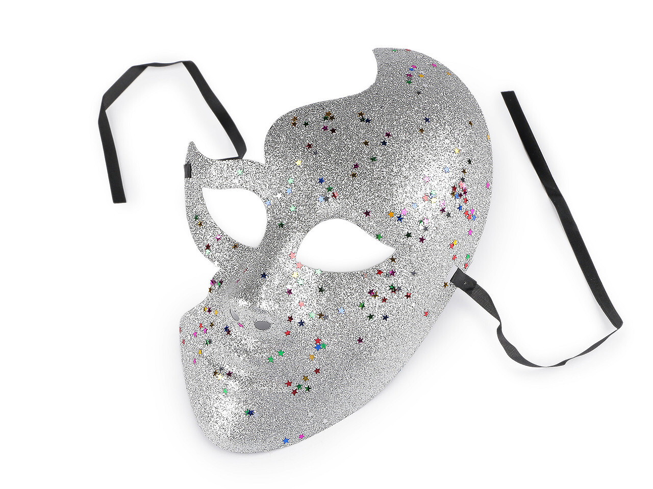 Benátskou masku využijete na různé večírky, plesy, párty, karnevaly i divadelní představení. Přidá mystiku vašemu vzhledu. Celá je pokrytá třpytivými glitry a drobnými flitry ve tvaru hvězd.Zavazuje se pomocí stuhy. przeczytaj całość