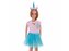 Karnawałowy kostium z opaską jednorożca i niebieską sukienką księżniczki pokrytą błyszczącymi gwiazdkami.
