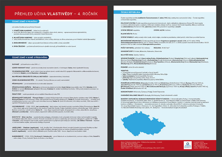 Przejrzyste opracowanie przeglądu materiału dla nauczycieli, dostosowane do potrzeb uczniów. Tabela przeglądowa - Wiedza o kraju I (4. klasa) - przegląd materiału - zawiera przegląd historii od początków do objęcia władzy przez ród Habsburgów oraz usystematyzowany przegląd podstawowych informacji o Republice Czeskiej. Tabela jest odpowiednia dla uczniów pierwszego etapu szkoły podstawowej. Tabela przeglądowa służy uczniom pierwszego i drugiego etapu. Tabela przeglądowa jest pomocą dla uczniów ze specjalnymi potrzebami edukacyjnymi Tabela przeglądowa jest odpowiednia dla uczniów przygotowujących się do wieloletnich gimnazjów