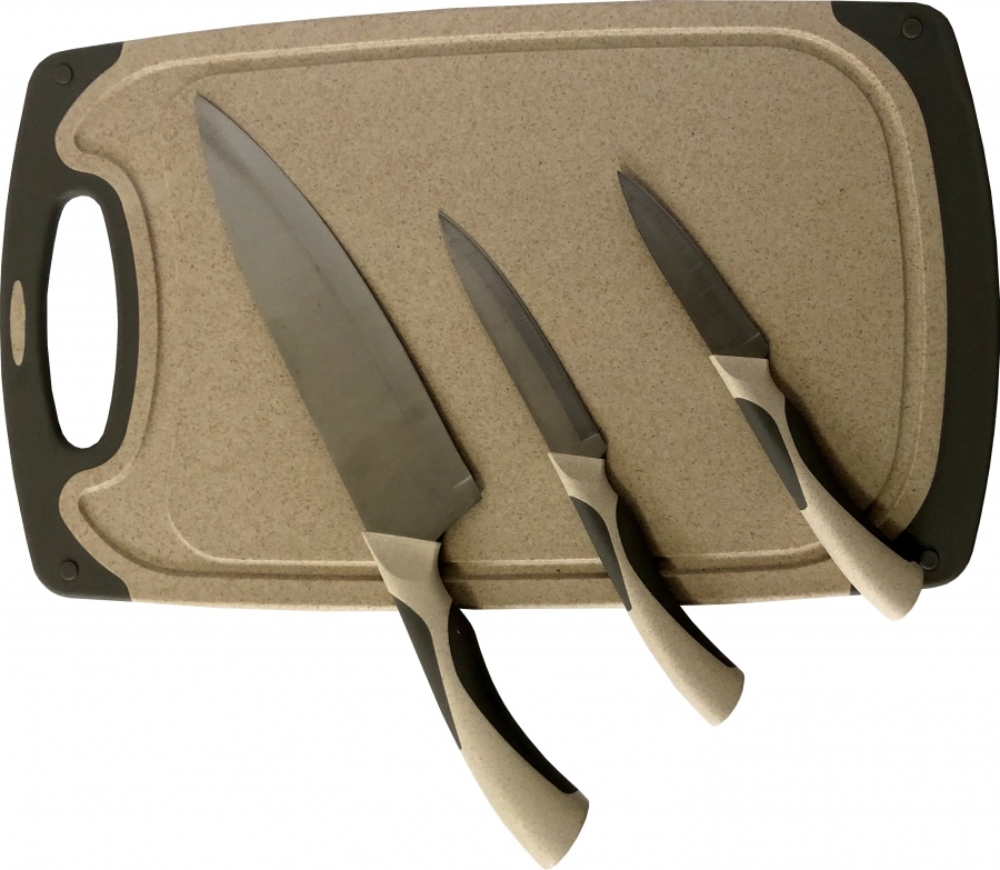 KOOPMAN, Sada prkénko + 3ks nožů, světle hnědá Sada prkénko + 3ks nožů bude mít využití v každé kuchyni. Nože mají ergonomicky tvarovanou rukojeť s nerezovou čepelí. Sada obsahuje prkénko s měkčenými soft okraji proti klouzání a pro příjemný dotek s rozměrem 40 x 24 cm, 1 x kuchařský nůž 34 cm,... przeczytaj całość