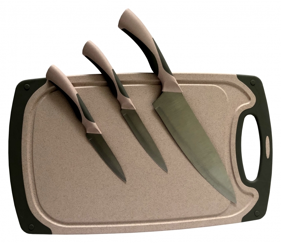 KOOPMAN, Sada prkénko + 3ks nožů, světle béžováSada prkénko + 3ks nožů bude mít využití v každé kuchyni. Nože mají ergonomicky tvarovanou rukojeť s nerezovou čepelí. Sada obsahuje prkénko s měkčenými soft okraji proti klouzání a pro příjemný dotek s rozměrem 40 x 24 cm, 1 x kuchařský nůž 34 cm,... przeczytaj całość