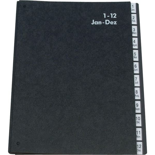 Stolní organizér, materiál - ražený karton, pružný hřbet, vnitřní listy s děrováním, jednostranný potisk formát-A4, rozlišení-1-12, barva-černá przeczytaj całość