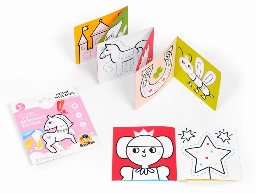 Zestaw 2 książeczek do rysowania i kolorowania, których formę i ilustracje dostosowano do wieku najmłodszych artystów.W dłuuugich książeczkach harmonijkach znajdziecie 23 ilustracje pełne prostych obrazków, które inspirują do rysowania po śladzie. To naturalny wstęp do rysowania i przyszłej...