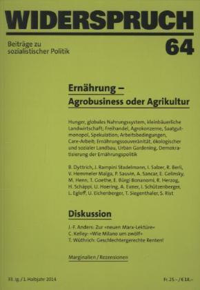 Widerspruch 64 versammelt Beiträge u. a. zu diesen Themen: Ernährungssouveränität contra weltweites Agrobusiness; Demokratisierung statt Regulierung der Märkte; Gentechnologie und Saatgutmonopolisierung; kleinbäuerliche Landwirtschaft; Bäuerinnen und Landarbeiterinnen; Urban Gardening und Vertragslandwirtschaft; Agrarpolitik der Schweiz und der EU.