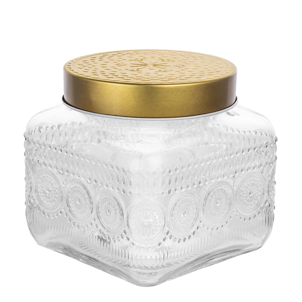 POJEMNIK SZKLANY KWADRATOWY Z POKRYWKĄ W KOLORZE ZŁOTA 12,5X12,5X12 CM DEK. DAISY