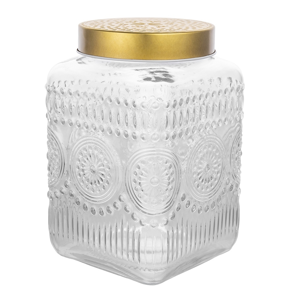 POJEMNIK SZKLANY KWADRATOWY Z POKRYWKĄ W KOLORZE ZŁOTA 12,5X12,5X20 CM DEK. DAISY