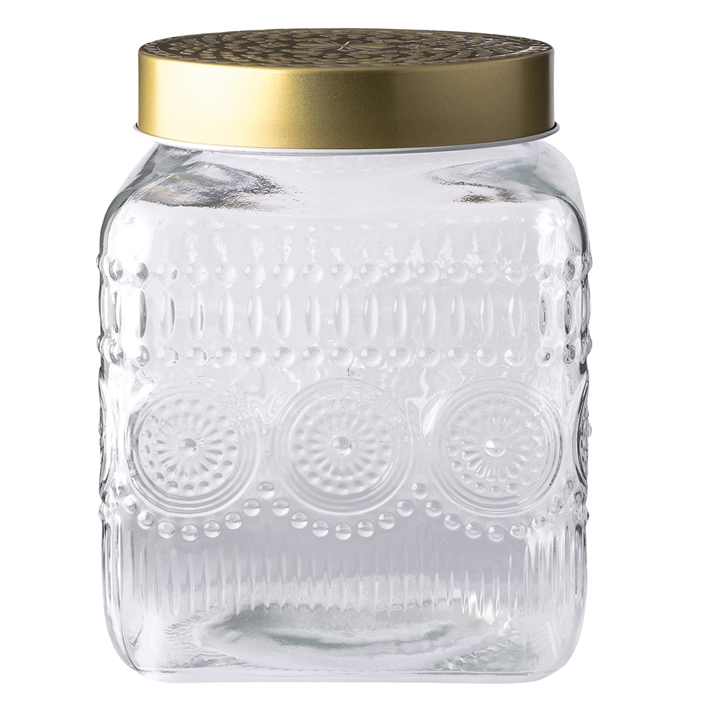 POJEMNIK SZKLANY KWADRATOWY Z POKRYWKĄ W KOLORZE ZŁOTA 12,5X12,5X16 CM DEK. DAISY