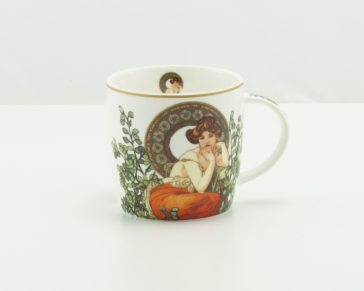 Podkreśl codzienne chwile picia kawy lub herbaty tym eleganckim porcelanowym kubkiem z motywem Alfonsa Muchy. Dzięki jego wyjątkowemu wzornictwu każda przerwa stanie się małym artystycznym przeżyciem.