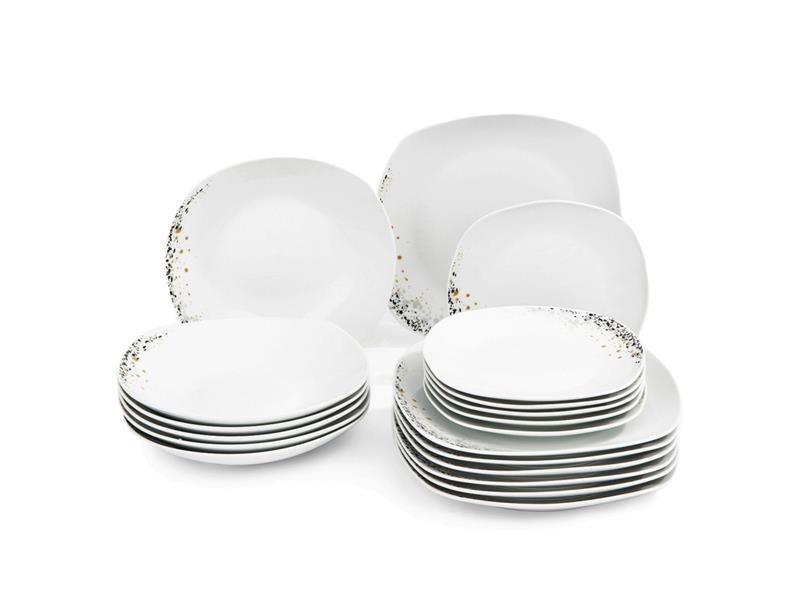 Jídelní sada porcelánová obsahuje 18 dílů – 6x talíř dezertní, 6x talíř hluboký a 6x talíř mělký. Hranatý tvar talířů. Jemný dekor. Talíře můžete dávat do myčky na nádobí, ale nedoporučejeme to – vlivem čistících prostředků používaných v myčkách může dojít k poškození dekoru (není pak důvod k reklamaci). Lze použít v mikrovlnné troubě.